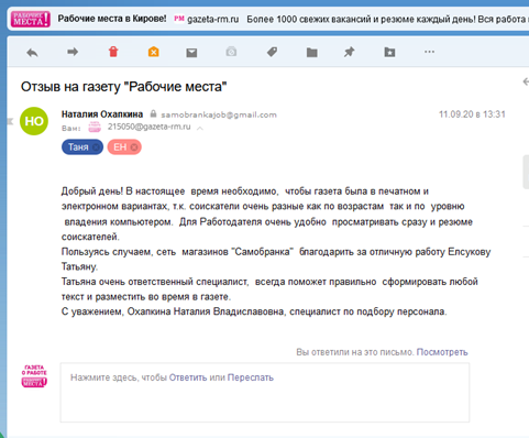 Мне очень нравится сотрудничать с газетой "Рабочие места". Менеджеры всегда вежливы, с ними приятно разговаривать.Объявления выходят вовремя.