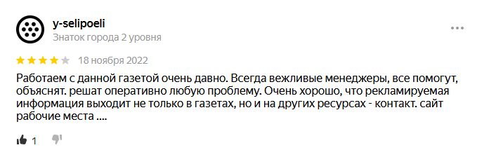 Достаточно эффективная газета. Много людей приходит, прочитав объявление в газете «Рабочие места». В нашей организации работают несколько сотрудников, которые пришли именно так. Хочется отметить безупречную работу менеджеров издания.
