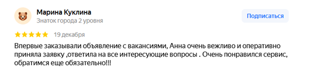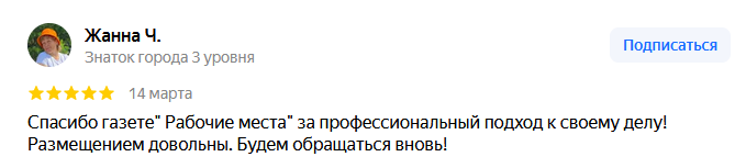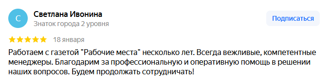 Поэтому газета Рабочие места стала реальным помощником в решении этой задачи. После размещения объявления с имеющимися вакансиями начинаются реальные звонки от соискателей, которые делают ссылку на именно на газету Рабочие места или ее электронную версию. Ну и огромный плюс сотрудникам, которые работают в газете: качественная работа, своевременное размещение информации, хорошие, броские макеты объявлений, просто с вами приятно работать.