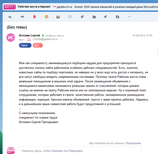За время сотрудничества сложилось такое ощущение, что газета «Рабочие места» всегда находится «на расстоянии вытянутой руки». С менеджерами легко связаться, издание вовремя доставляется, а главное наши пожелания по размещению, размерам, содержанию объявления выполняются безукоризненно.
